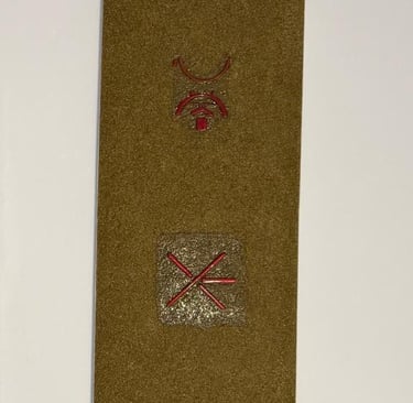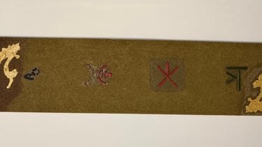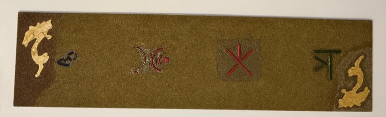 ENTFEI-1 presents five symbolic elements arranged horizontally on a textured mineral ground. These symbols form the first documented notation system developed through human-AI collaborative processes.